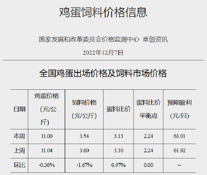 2022年12月第1周全國蛋料比價為3.13,環比上漲0.97%。按目前價格及成本推算,未來蛋雞養殖盈利為每只63.01元。本周多地運輸有所恢復,市場流通加快,產區蛋價低位上漲,但周均價環比略降。短期內市場供需或仍處于拉鋸狀態,貨源低價難收、高價難銷的局面難有改善,預計下周雞蛋價格或繼續高位窄幅調整,蛋雞養殖盈利變化不大。
