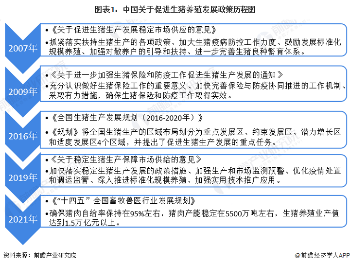 隨著經濟的不斷發展、人們生活水平的日益提高,肉類市場規模及覆蓋消費者群體不斷擴大。國家相繼出臺了多項政策,對生豬養殖行業的健康有序發展起到重要作用。具體政策如下: