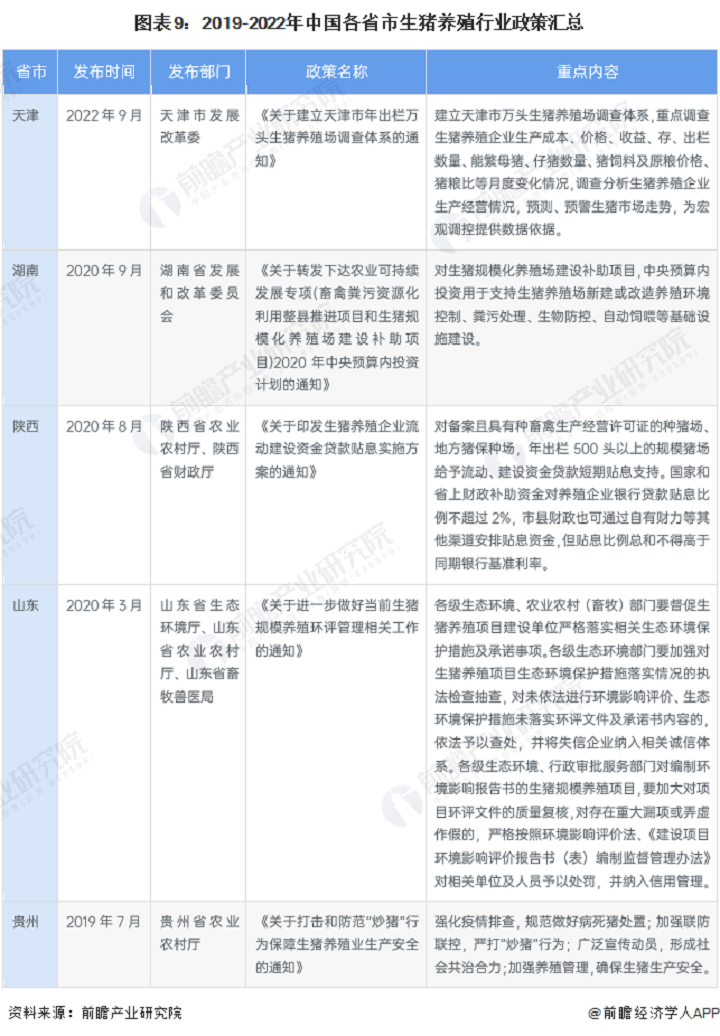 2019-2022年,天津、湖南、陜西、山東等部分省市也發布了生豬養殖行業政策,主要涉及資金貸款補貼、生態環境保護、打擊防范“炒豬”行為等。