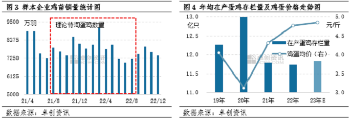 根據當前存欄基數、補欄量以及補欄心態預判,預計2023年產蛋雞理論存欄量同比增加0.85%,蛋供應較2022年略寬松,但仍低于正常水平(12億只)。