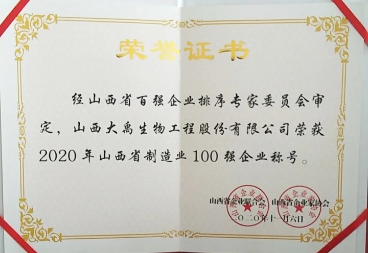 大禹生物榮獲山西省制造行業(yè)100強(qiáng)榮譽(yù)稱(chēng)號(hào)。
