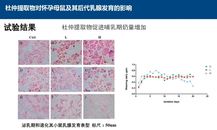 杜仲提取物對懷孕母鼠及后代乳腺發(fā)育的實驗可以得出杜仲提取物可以促進(jìn)懷孕期乳腺增殖、促進(jìn)哺乳期奶量增加、促進(jìn)青春期乳腺導(dǎo)管增殖和末端芽結(jié)構(gòu)(TEB)的形成。